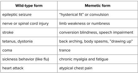 In the wild-type form, the symptom is explicable as a malfunction in an identifiable biologic mechanism. By definition, this isn’t true of the psychosomatic, or memetic versions, which result from a still obscure central nervous system process.