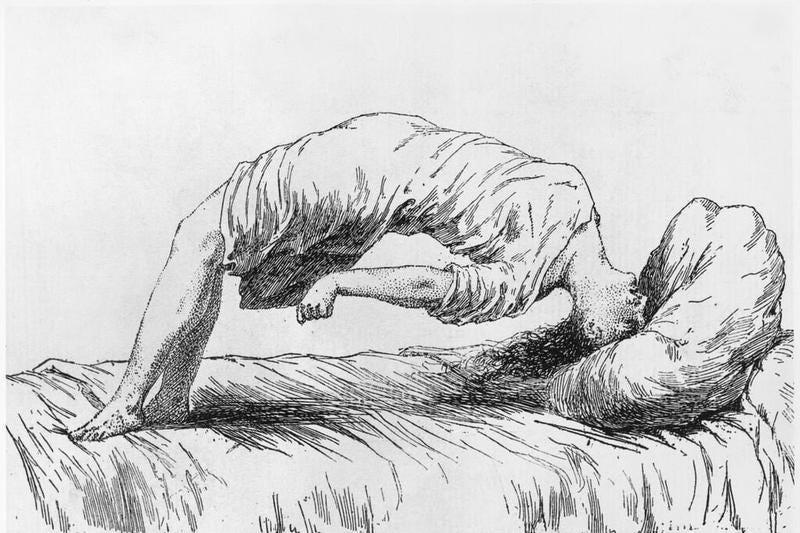 The narrative gets going around 1830. For many decades before this, Shorter asserts, “hysterical” patients presented with a wide assortment of unexplainable pains, numbness, vomiting, temporary blindness, fainting fits, and so on. These ailments often improved with neutral therapies like baths, enemas, and exorcisms, suggesting that, at least for some, the cause wasn’t an undiscovered medical disorder.